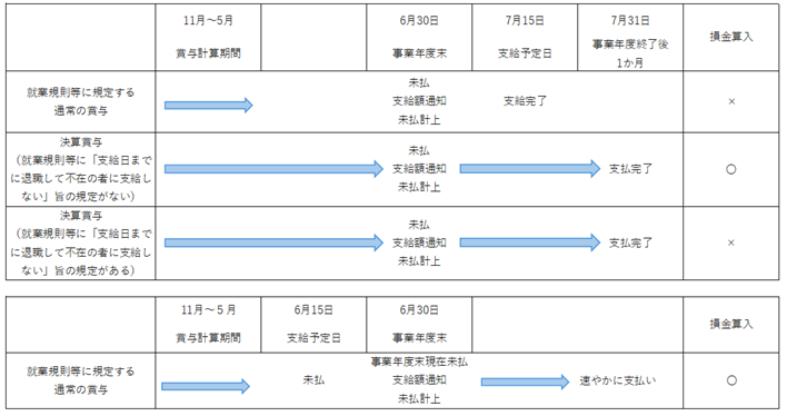 例えば、事業年度末が6月、通常の賞与の計算期間が11月から5月の法人について、通常の賞与の支給予定日が7月15日の場合及び6月15日の場合、さらに決算賞与、それぞれの場合について未払賞与の損金算入の可否を示すと図のようになります。