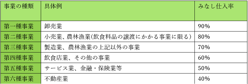 事業の種類ごとのかかる消費税額の表