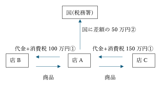 その場合、商品をBから仕入れるにあたって、Bへ仕入に係る消費税を預けています。そして、商品をCへ売るにあたってCから売上に係る、消費税を預かっています。例ではBに100万円預けていて、Cから150万円預かっているとします。